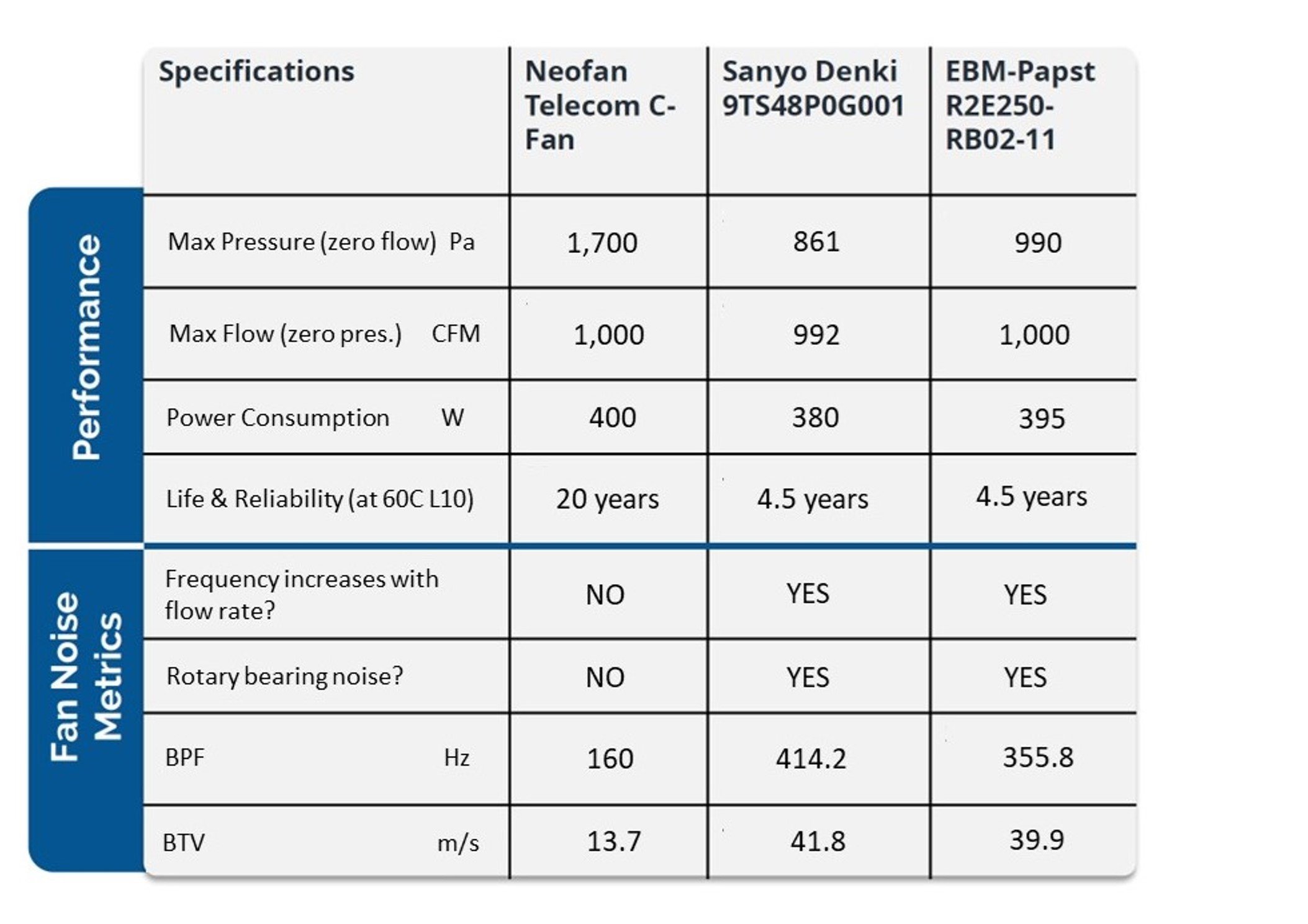 C-Fans address all three sources of noise by delivering a given flow and pressure at much lower BPF and BTV, and eliminating rotary bearings and their noise. The table shows how C-Fan noise metrics compare with the industry’s best-in-class centrifugal rotary fans.